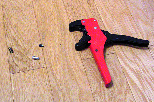 おわッ!! びっくりしたッ!! いきなりぶっコワレたぞ。なんだよもー……。そーなのだ、100円ショップで買ったワイヤーストリッパーのアゴが突然にハズレたのだ。100円ショップの道具であるから、あまり大きな期待をせずに購入したのだが、期待に違わず非常に動きがザツで、モノとしての魅力に乏しいアイテムではあった。しかしながら、あまり気持ちはヨクないものの、結構ちゃんとコードの被覆を剥いでくれるので重宝していたのも事実であった。