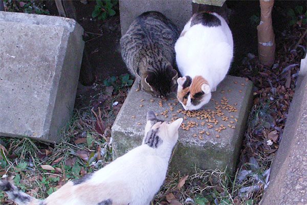 とか考えつつ、図書館の近所の公園をブラつきつつ、スナック菓子のカールなんぞをつまみつつ、ノラネコの写真を撮ったりする。コイツら以前に桟橋の下で猫団子になっていたトリオではないか。仲よきことは美しきかな。
