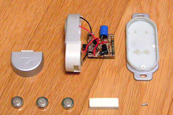 トランジスタと抵抗器がいくつか載っていたが破棄。基本的には磁気スイッチと、スライドスイッチ、LR44x3を収穫とする。磁気スイッチはハンダ吸い取り線を利用して取り外したのだが、熱を加えると磁力が衰えるらしく、取り外し直後は稼動しなかったが、冷えたら元に戻った。はー、びっくりした。