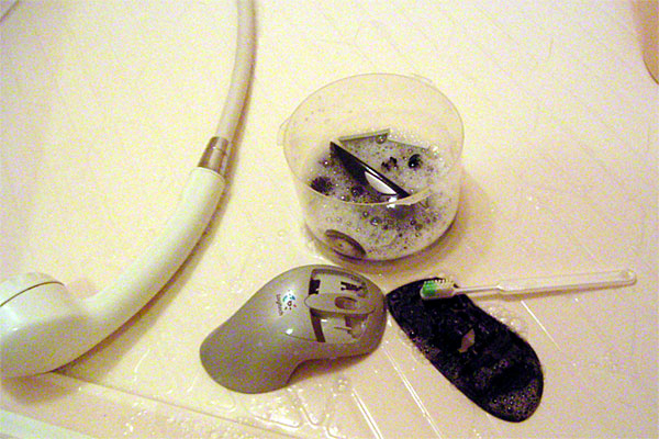 両脇のゴムの部品には手垢がネッチョリと付いているので、CD-Rのスピンドルケースのフタに部品をまとめて突っ込んでボディソープでガラガラと洗う。ホテルYRPで温存しておいた安物の歯ブラシの出番だ。ガシガシとコスる。気の済むまでコスったら、キッチンペーパの上で乾かす。気の短いオイラはカメラに使うエアーブロワーで水気を吹っ飛ばす。気の長い人はちゃんと乾くまで待とう。
