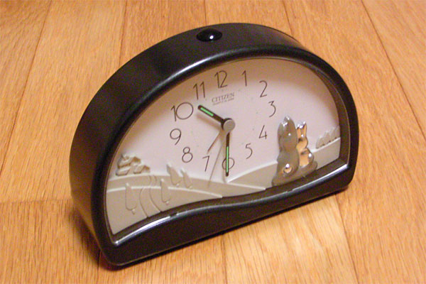さてこの時計、なんと音声のアラーム音を発する。すがすがしい鳥のサエズリとともにちょっと鼻づまりの女性の声で「おきなさい朝ですよ」というのだ。比較的音量も大きいため、寝ぼけて止めてしまわない限りちゃんと起きられる。一時期ジージーという音を発したので壊れてしまったかと思ったが、電池の消耗による症状であった。発生する予兆もあるので、とても良い信頼性の高い目覚まし時計であると思う。