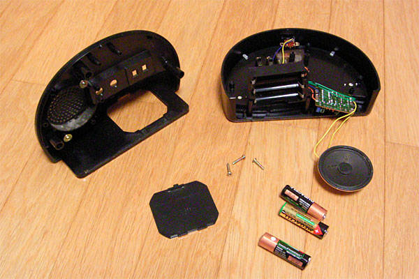で、とりあえずバラしてみる。中身はシンプルそのもの。時計のモジュールと、音声を発するための基盤が1枚、デカ目のスピーカー、テッペンのアラームオンオフスイッチと、スライドスイッチが2個。スライドスイッチは「アラーム音のモニター用」と「アラーム音の音量の大小」だ。これまたなかなかニクい機能である。