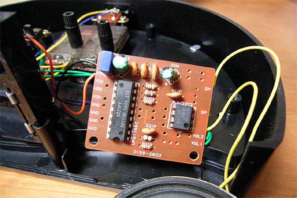 結局、制御基盤とニラメッコしつつ、回路図を起こすことにした。カッコよくいえばリバースエンジニアリングである。こんな簡単な回路でリバースエンジニアリングもクソもない気もするが、なにしろ黙々と回路を追い、1時間ほどで回路図を起こすことができた。概ね想像したとおり、左のチップが音声信号を発し、右のチップはアンプらしい。アンプにはJRCの2073Dと書いてあるので、すかさずググってどんな働きをする石なのか調べてみるコトにする。