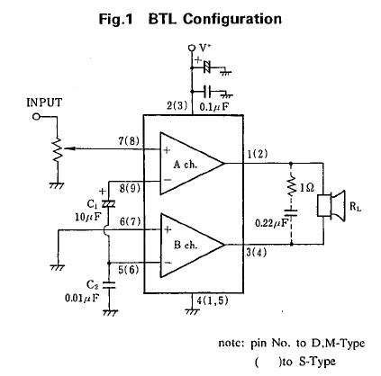 しばらくして気がついた。もしかしたらデータシートに適応例として載っているのではないかと……ほらビンゴだ。データシートの後ろの方にまったく同じ結線方法が載っていた。2回路入りのオペアンプを使ってモノラルを増幅する場合はこういう使い方もありなのか。確かにステレオとして使うよりも倍近い出力が得られるような記述がある。原理はよくわからんが、マイナス側を逆位相に駆動して出力を稼いでいるような雰囲気の回路だ。最近のカーステでも1DINで高出力のものはそんなコトしてるようなコト書いてあった気がするなぁ。すると先日の秋月のTA8207Kも2回路入りなのだが、同じように結線すれば使えるのだろうか? TA8207Kのデータシートにはそんな適用例はなかったような気がするが。