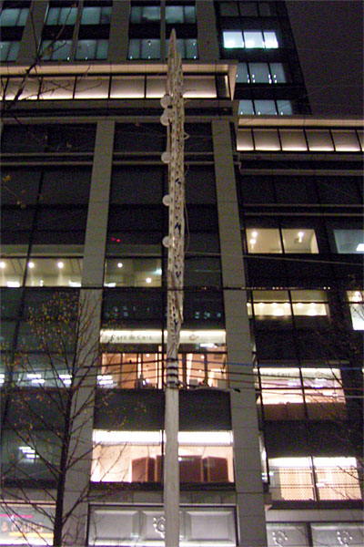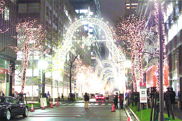で、地下鉄の改札を出たあたりでイキナリ「今日のミレナリオは荒天のため中止」という張り紙を発見。ガガーン。中止かよー、すいよー、もくよー……。それほど気合を入れているワケでもないので、それほどショックではないのだが、せっかくきたのにそりゃないべ。すっかり雪も上がっているし、観に来たっぽい人々も結構いるのだが、中止は中止。しかたなく、適当にデジカメで写真を撮る。