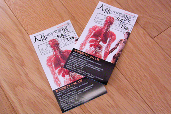 有楽町でカミさんと合流し、人体の不思議展に入場する。この催しはヒトコトでいうと「本物の人間の干物展」である。なんでもプラストミックという新しい技術による標本化らしいが、本物だけにスゲェ迫力である。文字通り「切り口の異なる」標本が20体以上並んでいた。グロいのが弱い人には悪夢のような場所であるが、そうでなければ一見の価値はある。脳みその標本を手に持ち重さを確かめて、最後の触れるコトのできる標本をイジって終了。ビーフジャーキーのような手触りだった。しかしこの催し、悪い冗談のようではあるが……最終的にどーゆー見方をすれば正しいのかの判断に困った。そんなに学術的なワケでもなし、ギャグっぽいトコロもあるものの、ギャグに走っているワケでもない。思えば、開場の人たちの反応も微妙だった気もするな。