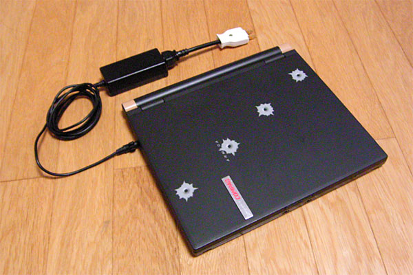 一番ムダに場所を取っているのは間違いなくアヒルメモリなのだが、電源ケーブルもかなりウザイ。だいたい、ACアダプタからノートまでのケーブルに結構な長さが確保されているのに、なんでACアダプタからコンセントまでにもコレマタ長い線が必要なのか? 特に100V側はケーブルがゴツいので取り扱いが面倒なのである。上記のコラムを書いたLeptonさんはブツブツ文句を言いつつも自作するコトはまったく考えていないようだが、こんなもん欲しけれりゃ作ってしまえばいいのである。