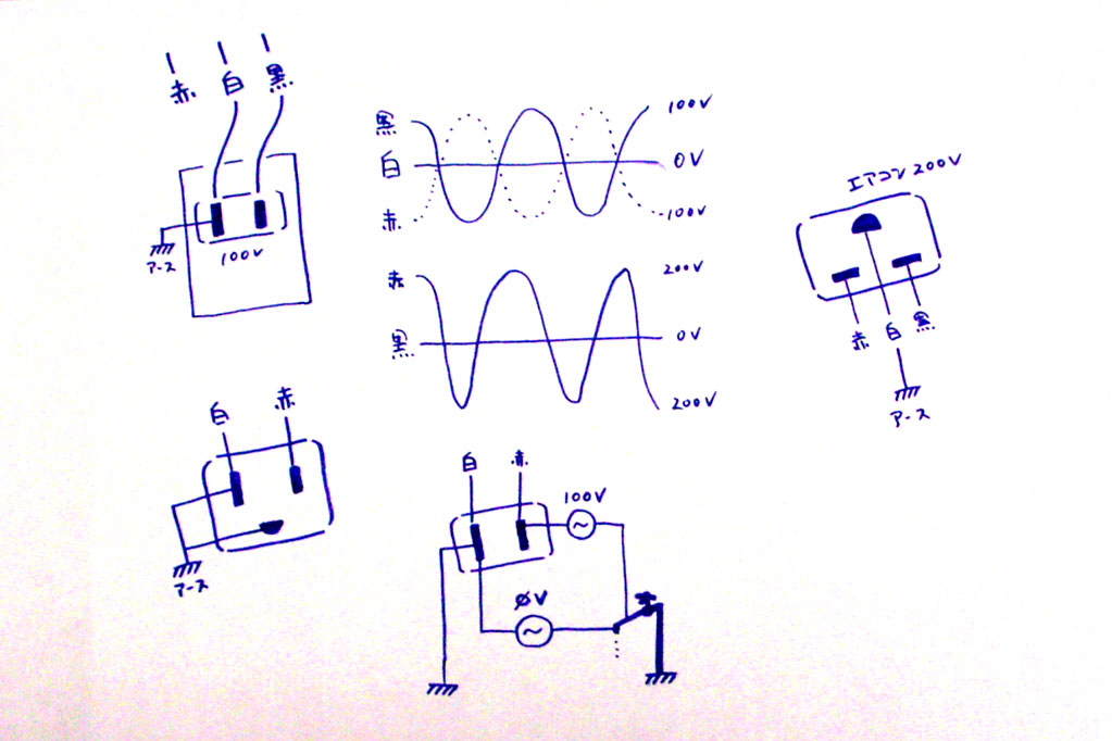 で、いろいろググっていると、だんだんわかってきた。家庭には、赤色、白色、黒色の電力線がきており「赤と白」または「黒と白」の組み合わせで100Vの交流電圧が得られ「赤と黒」の組み合わせだと200Vの交流電圧が得られるということである。でもって、赤と黒は触ると感電するのだが、白は接地しているので感電しないらしい。また、一般的なコンセントは穴の大きさが左右で微妙に異なり、大きいほうが白に接続されているらしい。つまり、大きいほうの穴に指を突っ込んでも、感電はしないというコトになる。