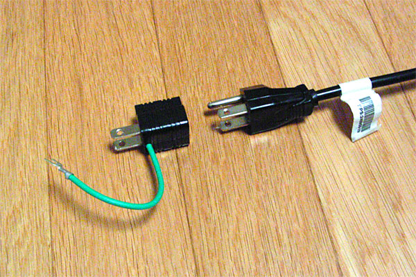 さて、これを作っていてちょっと疑問に思ったのが「アース」である。もともとオイラのノートPC、COMPACのARMADAのACケーブルはアース付3Pプラグに変換プラグを介して2Pプラグ&アース線という形状になっている。このアース線というヤツ、オイラはちゃんと接続している人を見たことがないのだが、いったいどうなっとるんじゃ? この際だ、要るのか、要らんのか、ハッキリしよーじゃねーか。