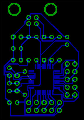苦労しつつも、なんとか回路図っぽいもが仕上がったので、基板のデザインに移る。自動配線機能を使って一発で基板完成じゃ!! ……と、思いきや、そうは甘くない。OLIMEXに片面基板を発注しようとしているのに、裏表に配線しちまうのだ。片面にするのはどうするんじゃ!? ……ここでまた少し悩んだ末、Autoの実行確認時に出てくるダイアログのPreferred DirectonsのTopをN/Aに変更すればいいことに気づく。片面じゃ、うりゃ!! とやると今度は世にも珍妙なパターンが現れる。部品配置が悪すぎるようだ。今度は配線を元の状態に戻す方法がわからない。毎回読み込み直すのもバカらしい。結局、左のパレットからRipUpを選択し、上の青信号アイコンを押すと全部元に戻ることに気づく。マニュアル読まずにやってりゃ仕方ないが、慣れるまで大変だこりゃ。結局、以前に自分でデザインしたユニバーサル基板上の配置に近い形で部品を並べると、一番スマートに配線が行われた。そうか。自動配線とはいっても、かなり人間様が関与しないとイカンのね。なるほど。