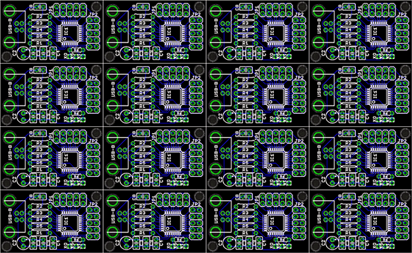 最大1,020ミリ×1,220ミリ(40インチ×48インチ)の基板が利用できます。そのサイズ内に大きさの異なる回路デザインを自由に割り付けられますが、それらは長方形に仕切られている必要があります。各基板には、据付ネジや基板の保持フレームなどのため、基板の周囲にスペースを持つ必要がありますので、多少は無駄な領域が必要です。80%以上利用できることもあれば、50%以下しか利用できないこともありますが、これは値段に影響します。