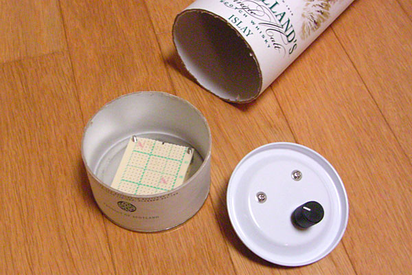 そこで発見したのが、ウィスキー的には選択を誤ったMcCLELLAND'S-ISLAYの瓶の外箱。そこそこ高級なスコッチは遮光のためか、こういう紙のケースに入っているのだが、これがなかなかシッカリした箱なのである。今まで上下1/3辺りでブッた切ってペン立て等に利用したりもしていたが、こいつをケースにしてはどうだろう? 上下は金属でできているから放熱にもバッチリだし、上のフタはかなりキッチリと閉まるのだ。高さは自在に調節できるしうってつけではないか。