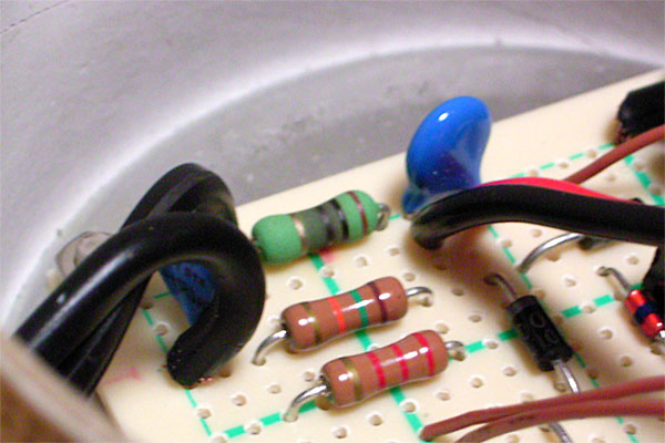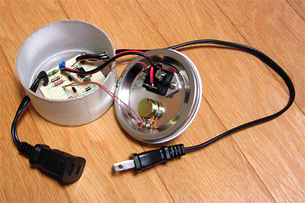 早速、高さを決めてカッターでブッた切る。どうしてもサイズ的にプリント基板が入らないので、キット添付のプリント基板を使うことを惜しげもなくあきらめた。替わりにユニバーサル基板を少し折り去って円筒内に収まるようにする。基板の片側に固定用のネジ穴を空けなおし、ケースの下側に基板固定用の穴を空ける。上側のフタにはトライアックとボリュームをマウントするための穴を空ける。どうよ!! コレ!!