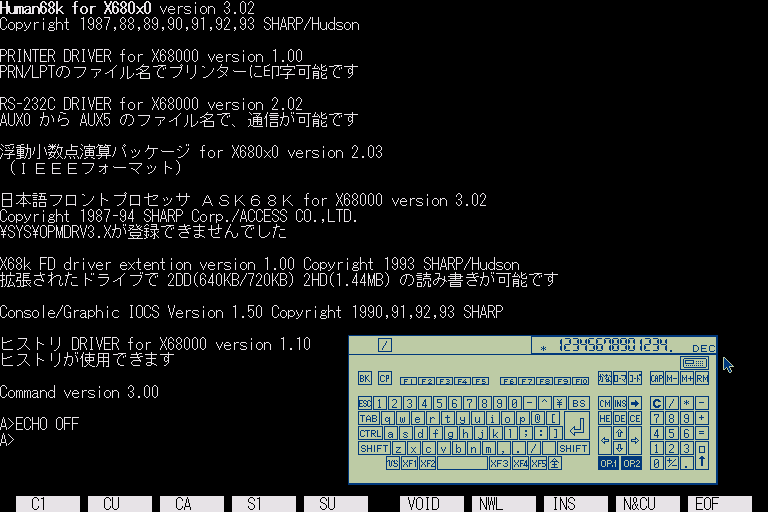 名機X68000の誕生から、ちょうど18年が経とうとしている今日この頃であるが、このX68000というパソコンにはOSレベルで「隣り合うOPT.1キーとOPT.2キーの同時押しによりポップアップする電卓」が装備されていた。DOS画面では「マウスの右クリックによりソフトウェアキーボードまで出てくる」のである。むぅ。文明開化のこの世にあっても、なお鮮烈な印象を与える機能ではないか。ちなみに電卓の数字のフォントは「7SEGタイプ」と「標準タイプ」から選択できた。さすが「電卓のシャープ」。憎いばかりの遊び心である。