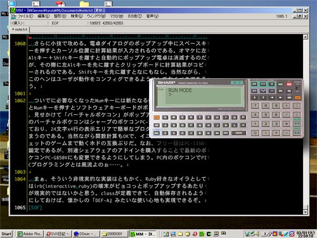 ついでに必要なくなったNumキーには新たなる使命を与えよう。なんとNumキーを押すとソフトウェアキーボードがポップアップする……と、見せかけて「バーチャルポケコン」がポップアップするのであるッ!! このバーチャルポケコンはシャープのポケコンPC-1350相当の機能を持っており、24文字x4行の表示エリアで簡単なプログラミングまでできてしまうのである。当然ながら関数計算もOKで、イニシエのプログラムポシェットのゲームまで動くホドの互換ぶりだ。なお、フリー版はPC-1350固定であるが、別途シェアウェアのアドインを購入することで最新のポケコンPC-G850Vにも変更できるようにしてしまう。PC内のポケコンでPICプログラミングとは風流よのぉ……。