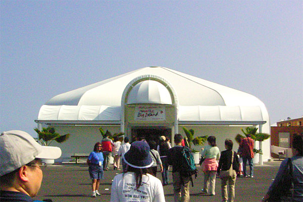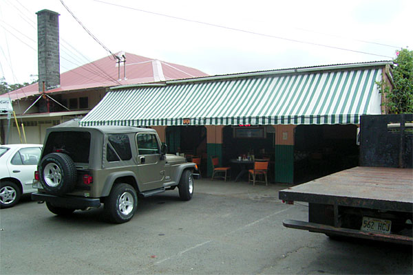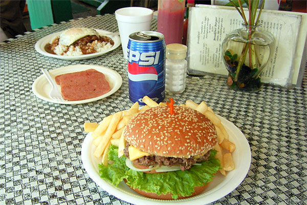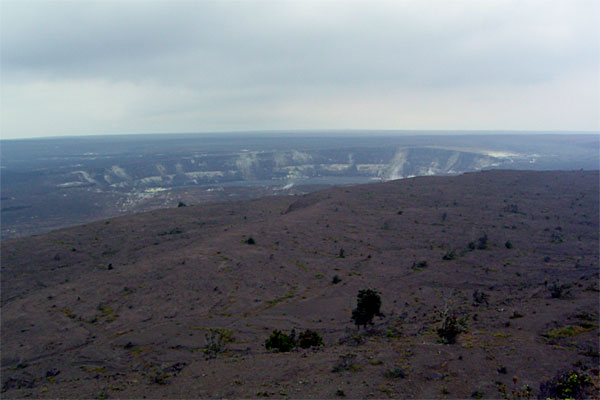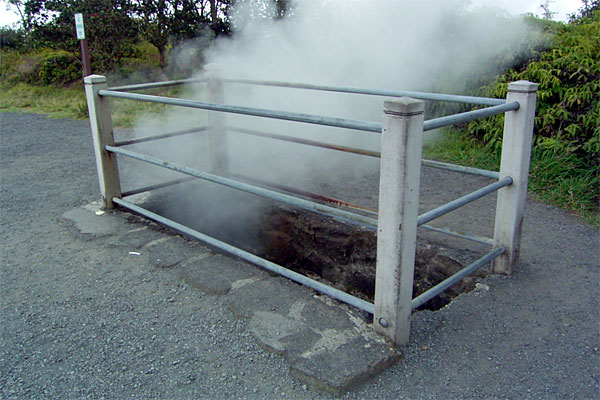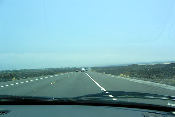 ほとんどが時速55マイルでカッ飛ばせるハイウェイとはいえ、火山まではコーヒー工場からは2時間タップリと要した。非常に変化のない、火山性の黒い地表がつづく道で、オモシロくもないドライブである。火山国立公園に着いた頃には、午後2時になっていたため、ボルケーノビレッジのJP'sカフェというレストランで昼飯。あまりに腹が減っていたので、やめときゃいいのに特大のハンバーガーにスパムをつけてしまう。クドい。クドすぎる。