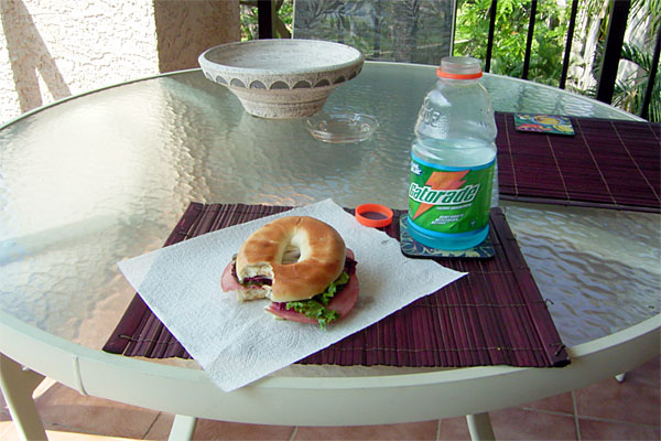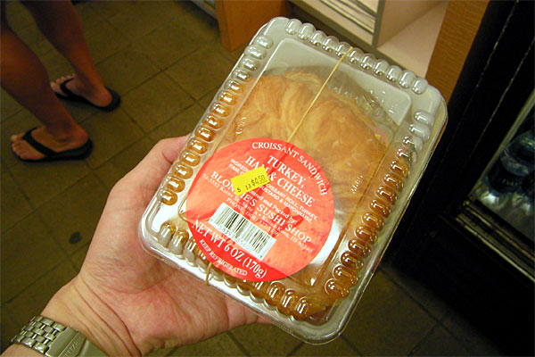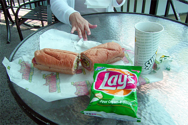 とりあえず、近所のキングスショップまで出かけ、偶然発見したサブウェイで昼飯。オイラはサブウェイに目がないのだ。しかも、ココのサブウェイは日本のモノとは大違いのボリューム。手で持つだけで、ありえない重さを主張される。やっぱり、こーでなくちゃイケネェ。やっぱり好物のレイズのポテトチップ、サワークリームオニオン味と、薬クサさが堪らないルートビアで流し込む。うまー。