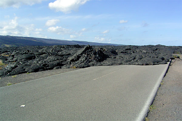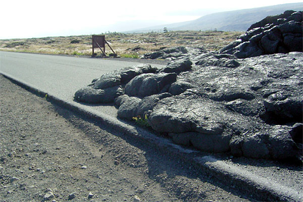 さらに標高3000フィートから、イッキに海面近くまで続く、チェーンオブクレーターズロードを車で下る。そんなにハゲしく下っている道ではないが、3000フィートを30kmで下りるハイスピードダウンヒルである。見渡す限りこの世のモノと思えない、黒々とした溶岩の固まった岩が続く。