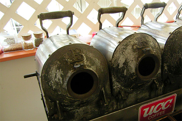 ちなみに、焙煎コーチにいろいろ聞いてオモシロかったのは、カフェインレスコーヒーの作り方。なんと、カナダの会社が特許を取っており、煎る前のコーヒー豆を特殊な水に漬け込むコトでカフェインレスになるらしい。また、恐ろしいことに水の成分は企業秘密のため、わざわざカナダまで豆を送る必要があるのだそうだ。くわー。