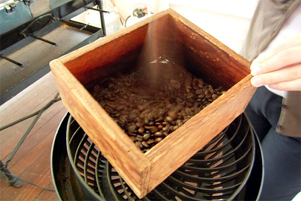 ブチあけた後も安心してはいけない。自身の熱でローストレベルがどんどん先に進むため、上向きのファンの上にフルイを載せて、勺でかき混ぜ温度を下げる。数分間かき混ぜれば、めでたくカリッカリの状態のコーヒー豆の完成だ。