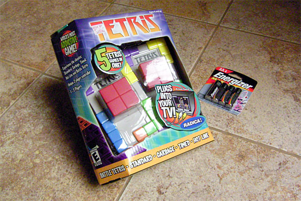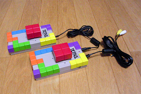 今日はハワイで買ってきたテトリスのゲーム機のレビューである。パッと見では、同形状のコントローラがふたつある商品構成だが、いわゆる2P側は単なる操作パネルになっている。1P側のみRCAのビデオ、オーディオ出力プラグ、電源スイッチ、2Pコントローラを接続するステレオジャック、電池ボックスが実装されている。