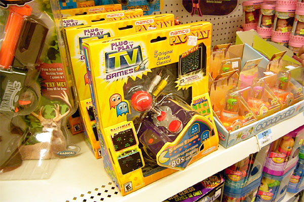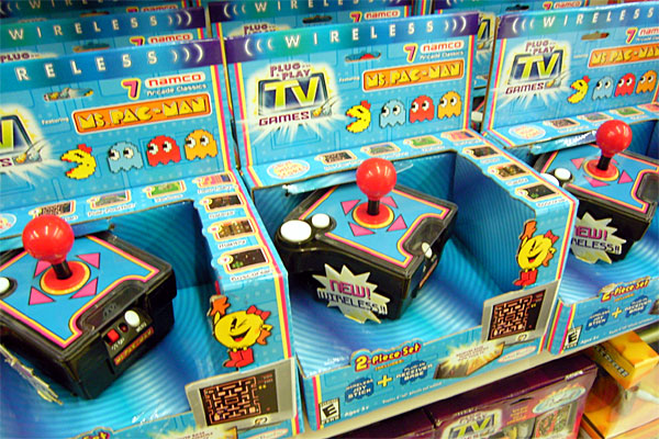 こーゆートコロで現地のアイテムを物色するのが好きなオイラだが、発見したぜ!! ワザワザ海外から取り寄せたゲーム機がフツーに売っている。しかも本家のサイトでもまだ扱っていないワイヤレスバージョンを発見だ!! スゲェ!! パッケージを見るに、ベースとなったMs.PacManの5つに加えて「ニューラリーX」と「ボスコニアン」が入っている。こちらはナナメOKのレバーであるから、清く正しくボスコが遊べるのだが、それとニューラリーXのタメだけに購入というのもなんかアレだ……と、いうコトで見送ることにした。パッケージには操作系を改善なんて英語で書いてあったが、レバーとボタンの感触はそう変わりない感じだったな。しかし、ワイヤレスはいいけど、単三電池が8本とはこれまた思い切った製品であるコトよ。