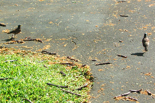 突然だが、ハワイ島には鳥がいる。オイラがかなり気に入ったのがこの「COMMON MYNA」という鳥。妙に車に警戒心のない鳥で、平気で道路の上をピョコピョコと歩いている。飛べないワケではないのに、車が来ても急がずに歩いて逃げるので、かなり轢かれてしまう。カワイソウではあるが、轢かれた後も綿毛のようにボワッっという状態になるダケなので、悲壮感がまるでない。なんなんだろう。しかし、のんきな性格でツガイで行動しているコトが多く、とってもカワいい。ツガイで連れて帰りたいトコロであった。