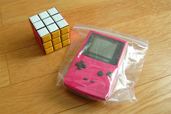 で、入浴準備だ。ルービックキューブはステッカーのタイプではないので、そのまま持ち込む。ゲームボーイはジップロックみたいな真空パックのビニール袋に入れて持ち込む。あとは防水の腕時計である愛用のナビホークで2時間を計測することにしよう。