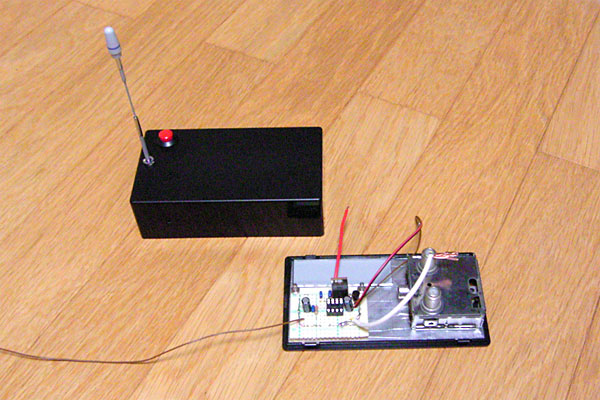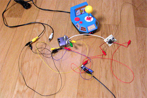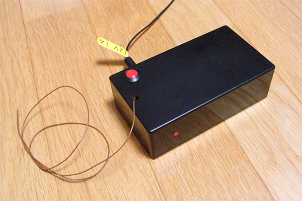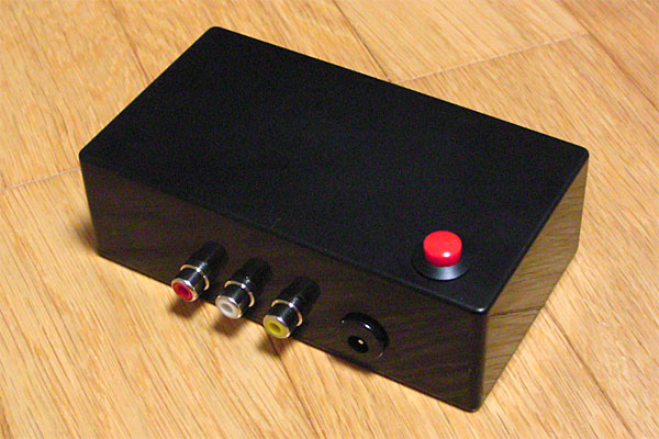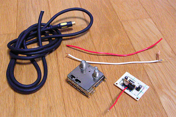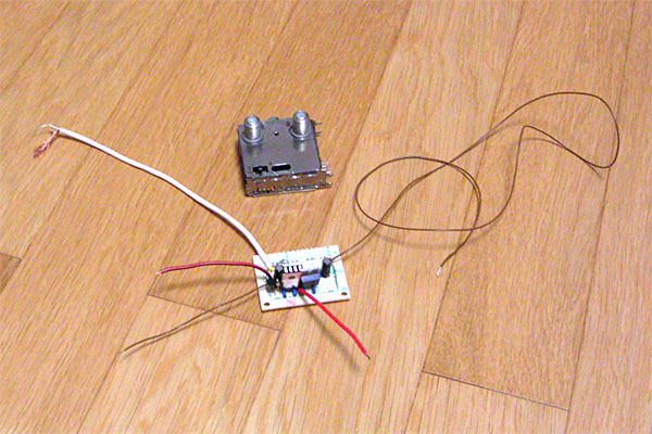 とりあえず、うまく動かなかった付加回路を取り外し、別の場所に違う部品で実装する。さらに、外部と接続するための配線も適当にくっつける。手前に出ている太い線が+12Vを供給する電源ライン、左に出ている線は上から、RFモジュレータからのVHF信号の入力用、RFモジュレータへの+5Vの電源供給用、RFモジュレータのビデオ信号選択用であり、右に出ている茶色の長細い線が増幅したVHF信号の空中への出力、つまりアンテナ、その実テキトーな長さのフツーのリード線である。あ、そうそう、VHF信号の入力に使っているケーブルは、以前の実験のためにチョン切ったS端子ケーブルからの臓器提供である。さすがに高周波を扱うのだから、その辺くらいは「ケチくも抜かりなく」である。