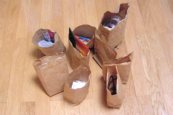 しかしココでハタと気がついた。部品の整理に「超整理法」を適用してみてはどうか。何も考えず、1回の買い物をひとつの紙袋(秋月名物の紙袋がイイ!!)にツッコみ、時系列に並べてしまうのである。オイラの場合、このブログに買い物内容をリストアップしているから、探したいパーツをnamazuで探し、日記エントリの日付をキーに紙袋を探せばよいワケだ。