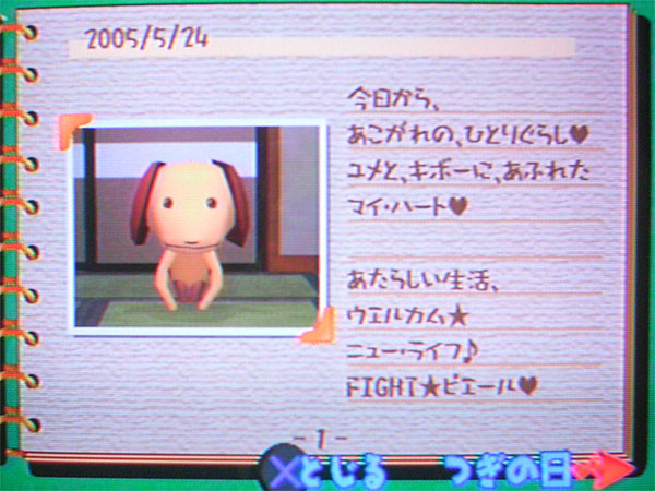 んなコトを考えつつ、ボタン電池を取り替えて、PS2で「どこでもいっしょ」を起動、新たに「ピエール」というイヌのキャラクタをポケットステーションにロードする。チマタではネコの「トロ」が一番人気ではあるが、オイラはこのピエールが一番大好きなのである。あぁ……ひさびさ。やべぇ……たのしい。小一時間ほどニヤニヤしながら小さい画面でピエールとの会話を楽しんでしまった。どうやら新規にキャラクタをロードしても、メモリ内容が完全に上書きするワケではないようである。購入当時に教えたコトバを使ってきたりするからだ。飛行教習に行っていたロスの「トーレンス」なんて地名まで出てきたりして、なつかしいったらない。