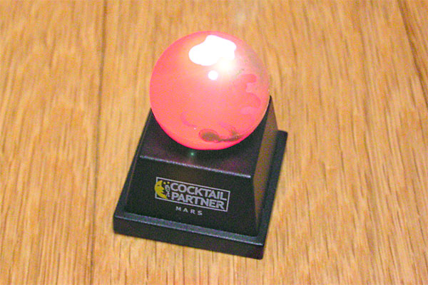 さて、そーいったトコロで、ジントニックをやりつつ、オマケの「惑星フィギュア」に食指を伸ばす。今回のモノは「火星」タイプであった。スーパーボールのような材質の火星と、下から赤い光でライトアップできる機能を持つ台である。台の裏にはスライドスイッチがあり、台の上面にある赤色のLEDをオンオフできるようになっている。