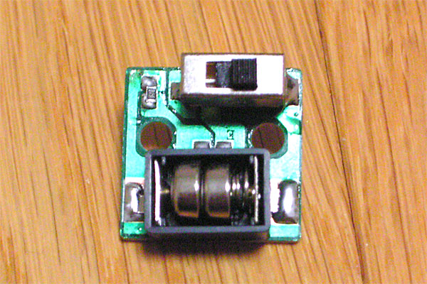 うーむ。ジントニックが130円ソコソコであるコトを考えると、いったいこのオマケは幾らなのであろうか? プリント基板、スライドスイッチ、ボタン電池x2、電池ケース、表面実装の抵抗(81Ω)、赤色LEDほか、これだけでもざっと100円はしそうである。すると、ジントニックは30円か?