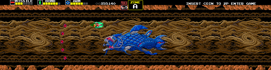 で、気づくとコインを投入しているのがダライアス(Normal Ver.)だ。このゲームはホントに飽きない。飽きないが、今回はフツーありえないルートを通ってみたりするコトにする。ナニも得するワケでもないのに、妙にキビしめの「A-C-E-I-N-S-X」というコースだ。途中、Nで天井にボムを投げソコなったため、追い詰められてミスり、残機0にまで追い込まれたが、なんとかタコを倒すことができた。次はLを通ってみようかしらん。