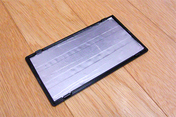 伸ばしたアルミに定規で角を付け、四隅を切り落とし、ケースの凹部分にピッタリとハマり込むように加工する。今度は両面テープをケース側に貼り付け、アルミを慎重かつ大胆にグイグイと押し込んでいく。スッポリと入ったトコロで、ムニムニと両面テープに定着だ。