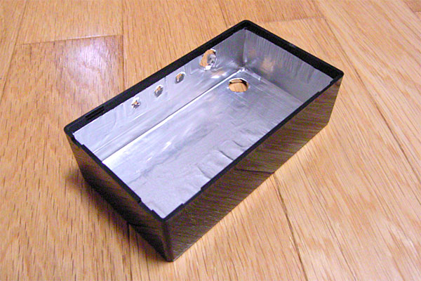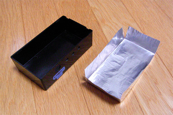 金属板はVHFトランスミッタに使うプラケースの内張りにして、電磁波のシールドを行うためのモノだ。最初からアルミケースを買ってもよいのだが、やっぱり金属加工ってちょっと敷居が高そうだし、値段も高そうだしね……と、ビンボーくさいコトをツブやきつつ、アルミをジョキジョキ。定規をヘラ代わりにして、アルミを平坦に伸ばし、両面テープを貼り付け、プラケースのフタに貼り付ける。うん、なかなかイイ仕上がりじゃん。