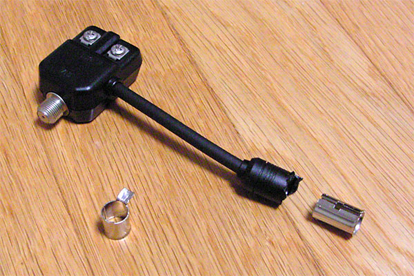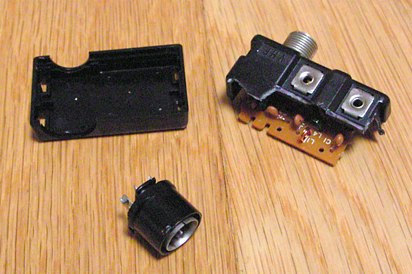 入力用の同軸ケーブルであるが、クリップで止めてある部分をハンダ付けしたいトコロだ……が、デキない。コテの熱量が足りないのか、ハンダが付きにくい金属なのかしらんが、ともかくウマくいかない。仕方ないので、同軸ケーブルが付いている部品をジャンク箱から探してきて、バキバキとバラす。あいや? コレVHFとUHFの混合器のようだ。内部にゴチャゴチャとした部品が載っている。しかも、なんだかイイ感じのコイルが載っているぞ。今回、MAR-8Aという高周波アンプICを使用したのに、RFC(Radio-Frequency Choke)コイルを省略してしまったが、事前にコレを発見していたら取り付けてたのにな。