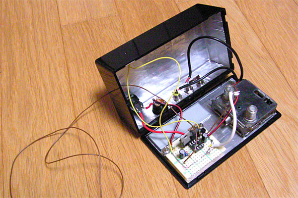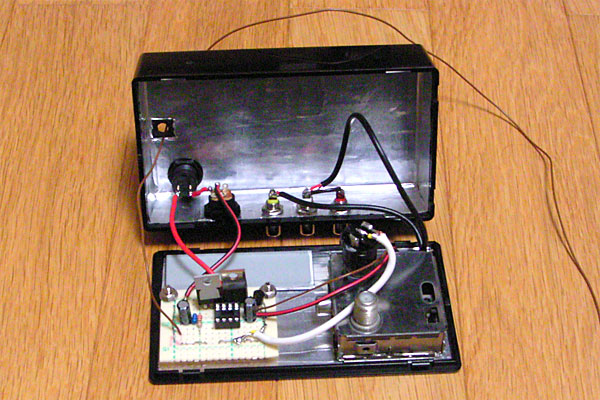 ついでにアンプ基板にも若干の修正を加える。謎の回路のトランジスタのベースへの接続に制限抵抗を入れるのを忘れて(ヤベェ)いたので、ムリヤリ基板の裏に10kをくっつけつつ、9Vのレギュレータを取り外す……というのも、ACアダプタに9Vのモノを使うコトになったからである。アンプICにACアダプタから直接電源供給するというのは若干不安があるが、安定化タイプのACアダプタであるから大丈夫であろう。よっしゃ。フタの上に部品を載せたダケの状態ではあるが、もう一度、動作テストをしておこう。