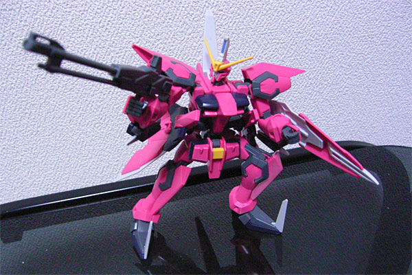 さて、この辺でムズかしい話はヤメて、完成したイージスを見てもらおう。Seedのプラモデルを作ったのは初めてなので、他と比較はできないが、このイージスは変形するため、他のモノより基本的な強度が劣っているとは思うが、ちゃんと自立するし、スタイルもかなりのモノだと思う。昔のモノに比べたら、ポーズの自由度も格段に高い。かなり遊べるといえよう。