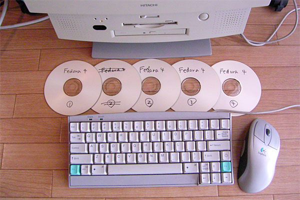 さて、じゃ、早速ダウンロードである。Fedoraの最新版は4。RedhatのEL/AS3が2.4カーネルであるのに対し、FedoraCoreは2から2.6カーネルである。まー、もうすぐウチの職場でもEL/AS4のサポートが開始されることだし、今からバリバリと2.4を注力するよりは、2.6主体で2.4に応用したほうがよいであろう。インストールするのはFedoraCore4とする。4を選択する事によって「FedoraCore For(4) Crash」というダジャレも効くコトだしな。がはははは。