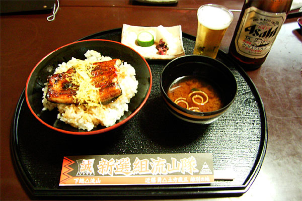 個室みたいなトコロに通され、落ち着く。うなぎといえば、出てくるまでに時間がかかるのがいい。ビールを注文してまったりとする。しかし、なんだこのメニューは。「勇」の名の付く料理がやたらと多い。なんでも、この辺りは新撰組の近藤がとっ捕まって斬首された地ということで、ブームに便乗しているようだ。勇丼、勇重、勇餅……しかし、勇サンデーはないだろ。そんな甘味に自分の名を付けられた近藤勇は、あの世で悲しがっているに違いないぞ。