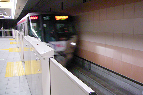 例によって、最近のホームだけあって、ホームの端にはドア付きの柵が設けられている。柵があるに越したことはないだろうが、どーも無駄な投資である気がして仕方ない。そのうち「ホームに柵がないなんてとんでもない!!」という時代が来るのであろうか?