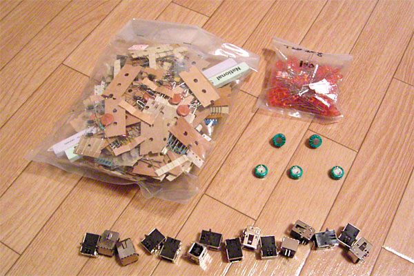 ちょっと思うところがあって、昇圧回路を組みたいのでチャージポンプ用にデカいコンデンサを買ってみた。電圧を安定供給したくてデカ目にしたけど、デカすぎるか……まぁ、やってみなくちゃわからない。あとは、例の変換基板の手元の枚数に見合うだけUSB-Bコネクタを大量購入。さらに、なんとなく安かったので、オレンジっぽいLEDとジャンク袋をひと袋ずつ。このジャンク袋は、なんだか楽しそうだ。なんだか子供の頃、おかしの詰め合わせを買ってもらった時のようにウキウキする気分だ。