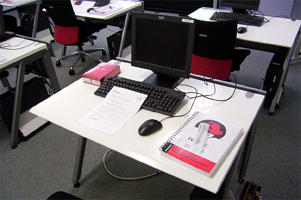 教室に着く。フツーのデスクトップパソコンとブ厚い教本。月曜から木曜まで講義を受けて、金曜が実技試験というスケジュール。講義の最初に、合格は難しいような脅しっぽいコメントを受けるが……どー考えても、毎日トラブルシューティングしまくっているオイラが受からないわきゃぁない。ナメきって講義中ハナクソをホジくりまくっていない限りは、大丈夫だろう。
