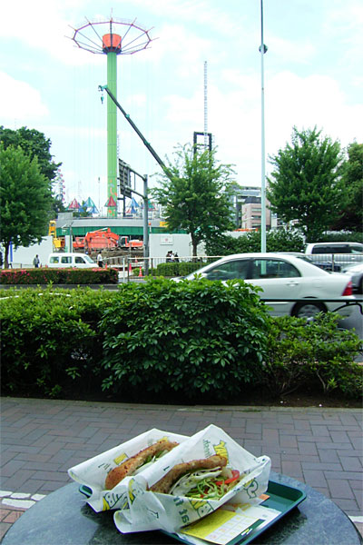 つくばエクスプレスの秋葉原ホームから、地上に出るまで5分。馴染みの日米商事を横目に、坂を上って下りて……やっぱり、なかなかの景色だ!! ……で、20分チョイくらいで水道橋である。右側には後楽園遊園地。おぉ!! レッドハットの教室のすぐ下にはサブウェイが!! オイラ、ココのサンドイッチが好物なんだよね。昼はココにしよう。