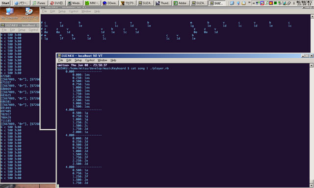 午後からも講義……しかし、演習の時間が長すぎる……あまりにヒマなので、自分のノートPCを取り出して、例の「キーボードでキーボード」のプログラムを進めてみちゃったりしてしまう……って、あれあれ、完成しちゃったよ。結局、Cではなく、Rubyで書き切ってしまった。ココ数日、チョロチョロと調べモノしたりして準備してたけど、その経緯をまとめると……