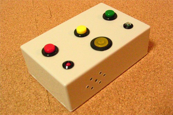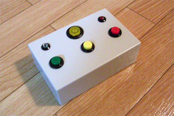3) 黄色のボタンを押すと、0.6秒間隔で12秒間、赤と緑のLEDが交互に点灯、その間、黄のLEDは消灯