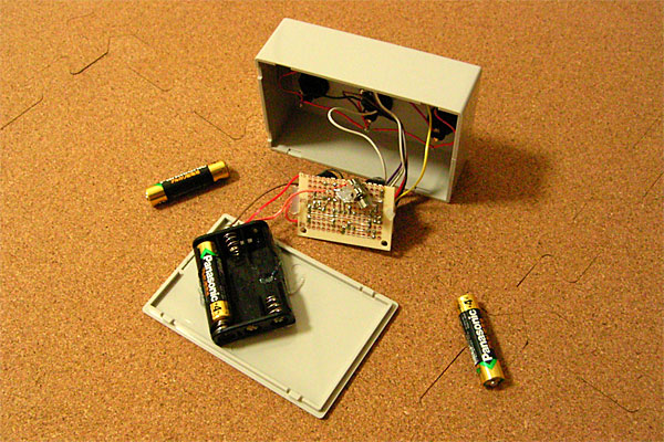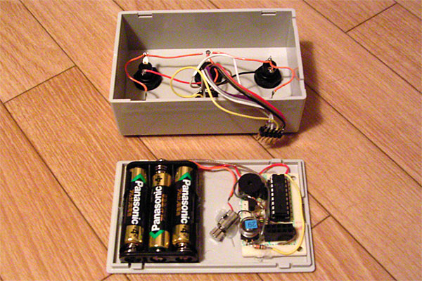 しかしながら、ちょっと問題なのがメロディの音量。あまりにも小さい。メロディICのデータシートに「圧電ブザーを直接駆動可能」とあったので、あまり考えずにそうしたけど、ケースに閉じ込めてしまうと、ちょっと音が小さすぎるようだ。ケースにいわゆる「ブチ穴」を穿けてみたが、たいした効果はなかった。スイッチングトランジスタをかますべきかもしれない。