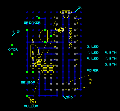 そんなに点滅するLEDが好きなら、そういうオモチャを作ってやるよ。オマケに手元の電子パーツを適当に組み合わせてオモチャっぽくしてやる。以前に、なんとなく買った、振動モータに、なんとなく買った、メロディICに、なんとなく買った、傾斜スイッチ……全部投入である。当然、制御はPICマイコンで。ポート数の都合でPIC16F648Aをチョイス。