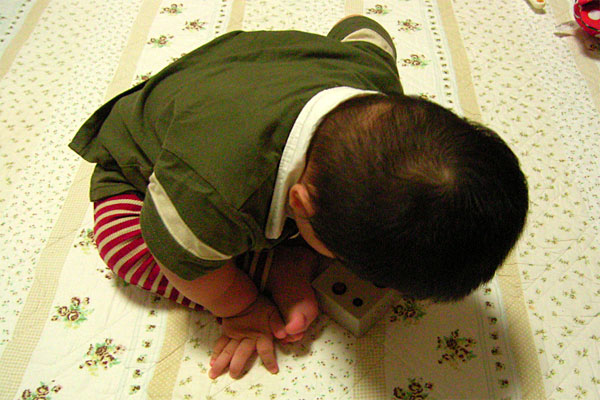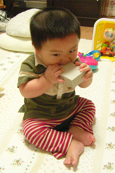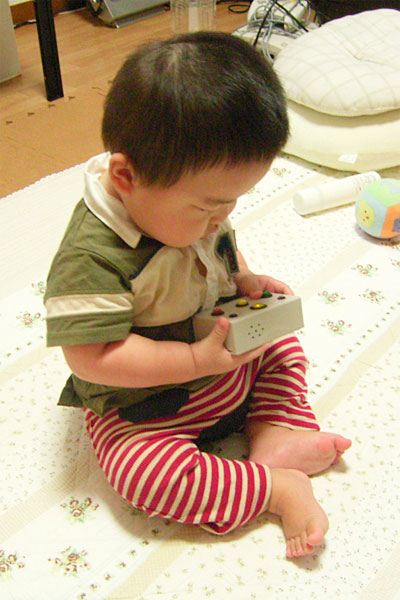 で、一通りの動作確認後、イッペイに渡してみる……かなり興味を示して、叩いたり、持ち上げたり、振ったり、ナメたり、カジったり……そのうち、ボタンが気になったのか、指先でボタンをハジき始め、ついには振動モータを駆動ッ!! 一瞬、驚いた顔を見せたが、直後にニヤっと笑った。どうやら、それなりにウケてるようだ。